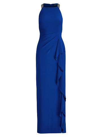 Slim fit. US size 8 has a 58" back length and a 35" bust. Square neckline. Center back zipper with a hook-and-eye closure. Embellished shoulder straps. Sleeveless silhouette. Ruching gathers at the front left waist. Ruffle at the front left skirt. Fully lined. Shell and lining: 95% polyester, 5% elastane. Dry clean. Imported. Model is 5'10"/178 cm and has a 32" bust, a 24" waist, and 34" hips. She wears a US size 2.
