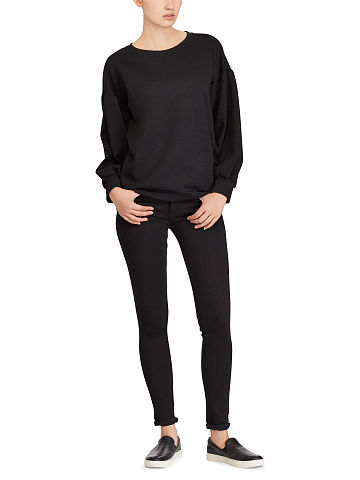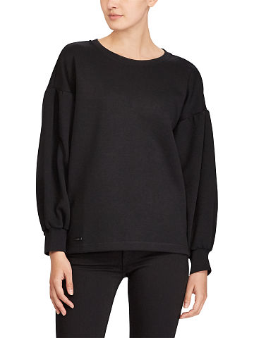Boxy fit. Intended to hit at the hip. Size medium has a 25½" front body length, a 27½" back body length, a 45½" bust, a 49" shoulder (taken from the dropped shoulder), and a 32" sleeve length. Sleeve length changes ¾" between sizes. Crewneck. Long balloon sleeves with ribbed cuffs. Dropped shoulders. Ribbed hem. "Polo" metal plaque at the front right hem. Hem falls longer at the back. Shell: 56% polyester, 44% cotton. Collar and cuffs: 58% cotton, 40% polyester, 2% elastane. Machine washable. Imported. Model is 5'10"/178 cm and has a 32" bust. She wears a size small.